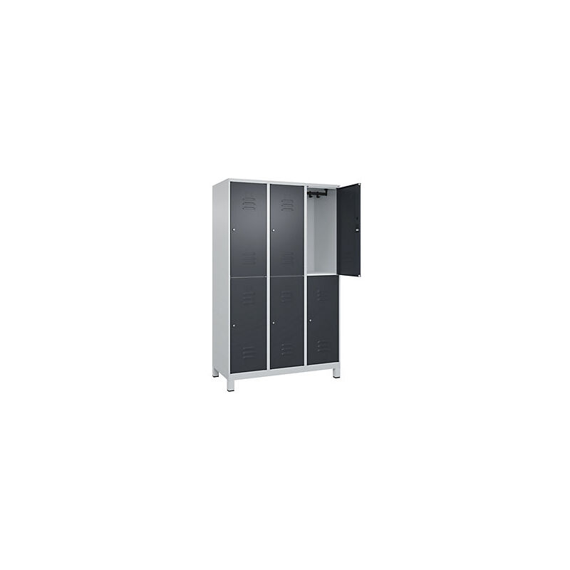 Armadietto a due piani Classic PLUS, 3 scomparti, grigio chiaro / grigio, alt. x largh. 1950 x 1200 mm, con piedini, serratura a cilindro. Fornitura = montato. Altezza = 1950 mm. Profondità = 500 mm. Larghezza = 1200 mm. Colore corpo = grigio chiaro RAL 7035. Colore porta = grigio antracite RAL 7016. Serratura = serratura a cilindro. Numero scomparti in larghezza = 3 pz. Numero scomparti = 6 pz. Larghezza scomparti = 400 mm. Materiale = acciaio. Dotazione interna = 1 asta appendiabiti con 4 ganci per scomparto. Altezza interna = 1787 mm. Profondità interna = 477 mm. Tipo di porta = anta a battente. Numero chiavi = 2 pz. Altezza zoccolo = 100 mm. Superficie = verniciatura. Frontali con fessure di areazione per una ventilazione ancora più efficace. Profili laterali delle ante chiusi per un'elevata resistenza alla torsione. Corpo con aperture di ventilazione nella parte superiore e inferiore per una circolazione ottimale dell'aria. Personalizzabili con piedini, zoccolino e piedini a