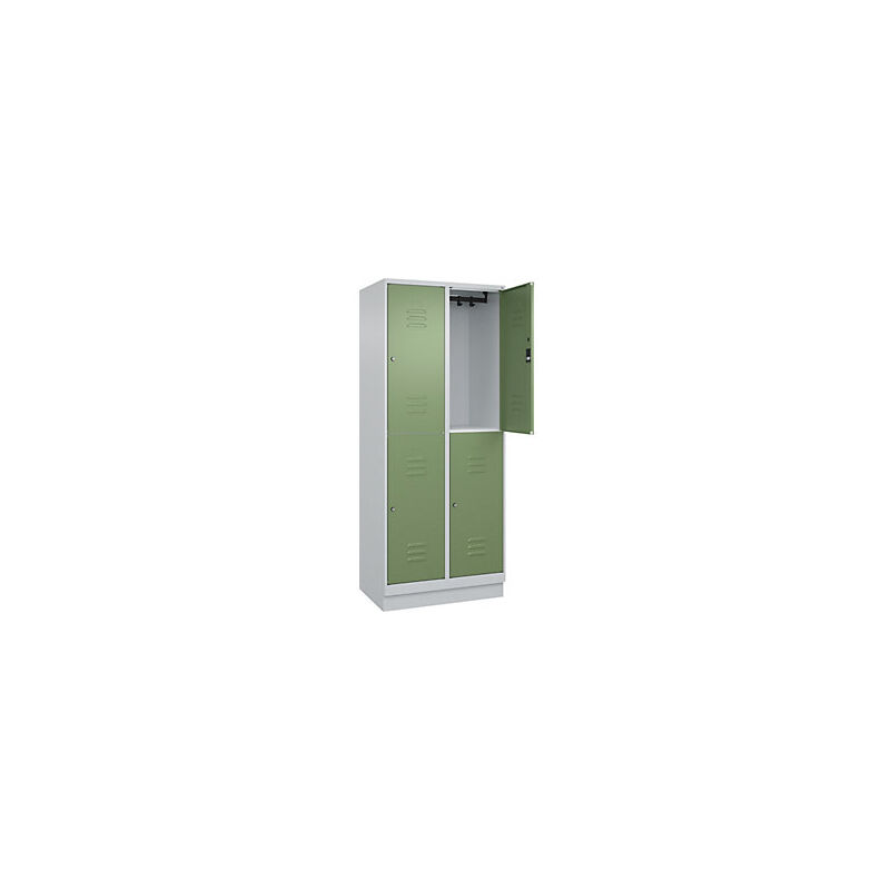 Armadietto a due piani Classic PLUS, 2 scomparti, grigio chiaro / verde reseda, alt. x largh. 1950 x 800 mm, con zoccolino, serratura a cilindro. Fornitura = montato. Altezza = 1950 mm. Profondità = 500 mm. Larghezza = 800 mm. Colore corpo = grigio chiaro RAL 7035. Colore porta = verde reseda RAL 6011. Serratura = serratura a cilindro. Numero scomparti in larghezza = 2 pz. Numero scomparti = 4 pz. Larghezza scomparti = 400 mm. Materiale = acciaio. Dotazione interna = 1 asta appendiabiti con 4 ganci per scomparto. Altezza interna = 1787 mm. Profondità interna = 477 mm. Tipo di porta = anta a battente. Numero chiavi = 2 pz. Altezza zoccolo = 100 mm. Superficie = verniciatura. Frontali con fessure di areazione per una ventilazione ancora più efficace. Profili laterali delle ante chiusi per un'elevata resistenza alla torsione. Corpo con aperture di ventilazione nella parte superiore e inferiore per una circolazione ottimale dell'aria. Personalizzabili con piedini, zoccolino e piedini a