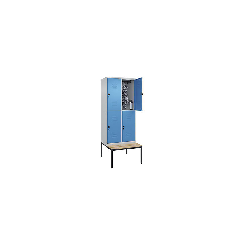 Armadietto a due piani Classic PLUS con panca, 2 scomparti, grigio chiaro / blu chiaro, largh. 800 mm, serratura girevole di sicurezza, panca integrata, legno duro di faggio. Fornitura = montato. Altezza = 2120 mm. Larghezza = 800 mm. Profondità = 815 mm. Colore corpo = grigio chiaro RAL 7035. Colore porta = blu chiaro RAL 5012. Serratura = chiavistello girevole di sicurezza. Numero scomparti in larghezza = 2 pz. Numero scomparti = 4 pz. Materiale = acciaio. Larghezza scomparti = 400 mm. Dotazione interna = 1 asta appendiabiti con 4 ganci per scomparto. Altezza sedile = 450 mm. Profondità sedile = 310 mm. Altezza zoccolo = 420 mm. Altezza armadio = 720 mm. Versione = con panca integrata. Serie = CLASSIC PLUS. Altezza interna = 1637 mm. Possibilità di regolazione per la messa in piano su superfici irregolari. Frontali con fessure di areazione per una ventilazione ancora più efficace. Profili laterali delle ante chiusi per un'elevata resistenza alla torsione. Corpo con aperture di