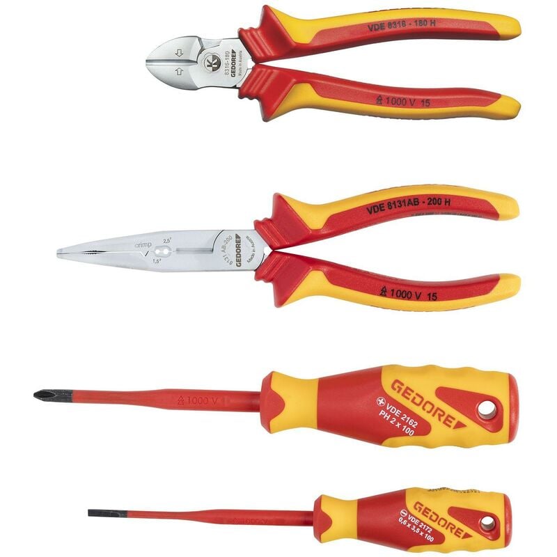 Pratica disposizione dell'assortimento, VDE 8314-160 H fresa laterale isolata con testa sottile (160 mm ), VDE 8131-AB isolata, pinza multipla angolata per taglio, spelatura, crimpatura e tenuta (200mm), VDE 2172 cacciavite sottile isolato per viti con intaglio 3,5 mm, Cacciavite a taglio sottile isolato VDE 2162 per PH 2 Contenuto per set VDE 2162 PH 2 VDE 2172 3,5 VDE 8314-160 H VDE 8131 AB-200 H Elenco dei pezzi (testo) VDE-Seitenschneider mit Tauchisolierung No. VDE 8314-160 H, 160 mm VDE-Mehrfachzange gewinkelt mit Hüllenisolierung No. VDE 8131-AB-200 H, 200 mm VDE-Schraubendreher SLIM DRIVE Schlitz No. VDE 2172 3,5, 3,5 mm VDE-Schraubendreher SLIM DRIVE Kreuzschlitz No. VDE 2162 PH 2 Paese di origine Österreich Lunghezza totale 120 mm Conservazione lose Peso netto [kg] 0,763 kg Certificato VDE 0 Registrazione REACH disponibile 0 Dimensioni dell'imballaggio 1 Contenuto (numero di pezzi) 4 tlg.