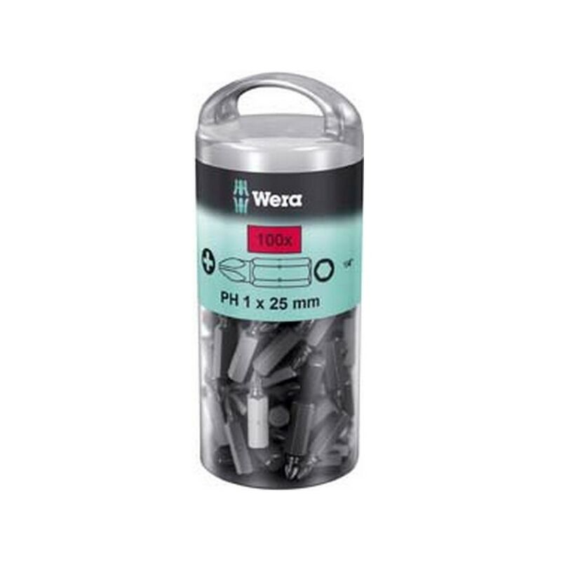 Bit 1/4, 'per viti a croce, PH, no. 851/4 1 Z DIY 100 Domare duro Zona di torsione A4 3126-C 6,3, ISO 1173 Per la consegna universale di avvitamento: nei 100 pezzi in un cilindro di plastica con un gancio.