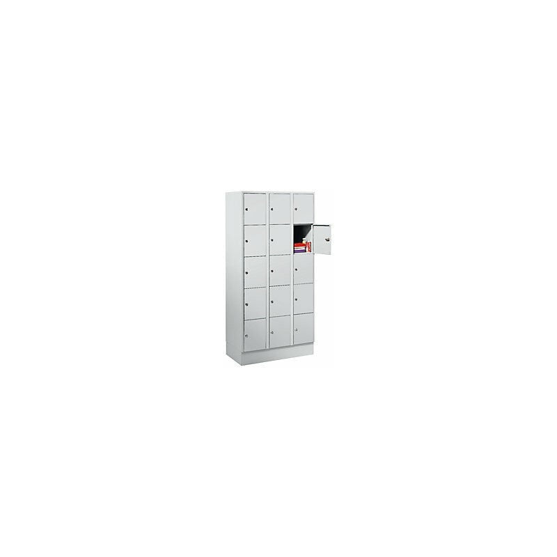 Armadio a scomparti con serratura, con zoccolino, 15 scomparti, 300 mm, grigio chiaro. Fornitura = montato. Altezza = 1800 mm. Profondità = 500 mm. Larghezza = 900 mm. Colore corpo = grigio chiaro RAL 7035. Colore porta = grigio chiaro RAL 7035. Serratura = serratura a cilindro di sicurezza differenziata. Numero scomparti in larghezza = 3 pz. Numero scomparti = 15 pz. Larghezza scomparti = 300 mm. Materiale = lamiera d'acciaio saldata. Altezza armadietto = 1800 mm. Dotazione interna = senza dotazione interna. Larghezza interna = 298 mm. Altezza interna = 300 mm. Profondità interna = 475 mm. Tipo di porta = ante piene. Numero chiavi = 2 pz. Altezza scomparti = 320 mm. Larghezza ripiani = 300 mm. Profondità ripiani = 500 mm. Altezza zoccolo = 100 mm. Struttura = saldata. Superficie = con verniciatura a forno. Sfruttamento ottimale dello spazio grazie agli armadietti sovrapposti (vedi Accessori). Con serratura a cilindro. In lamiera d'acciaio saldata. Corpo sempre in grigio chiaro RAL
