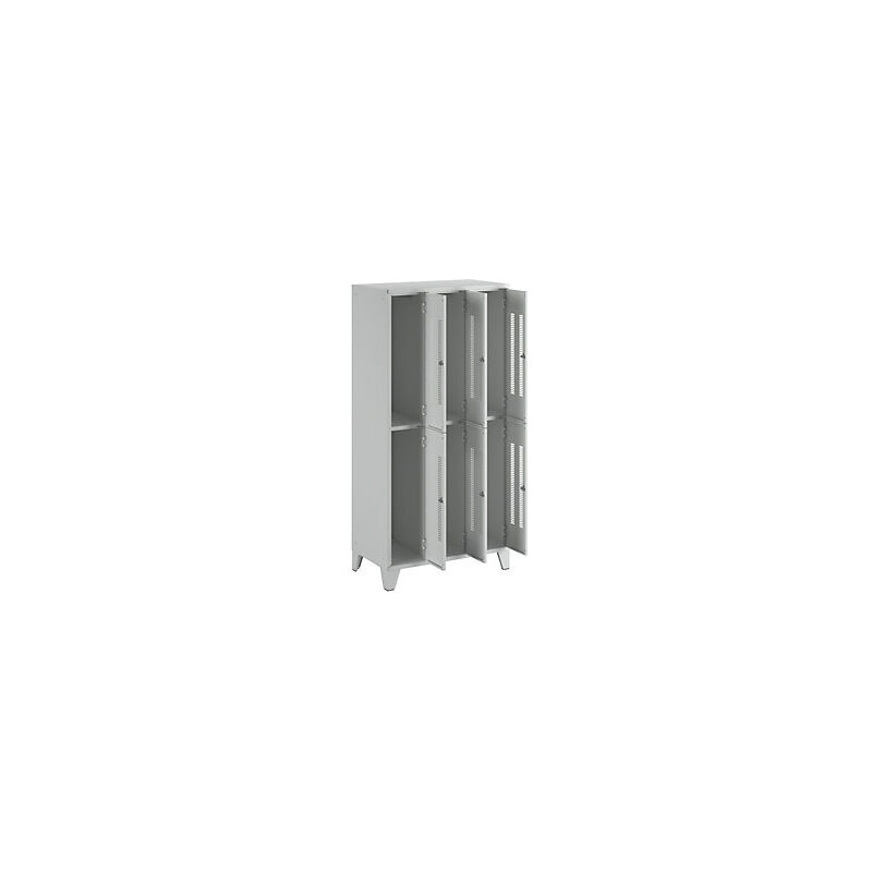 Armadietto in acciaio con piedini, scomparti a metà altezza, ante forate, larghezza scomparti 300 mm, 6 scomparti, grigio chiaro. Fornitura = montato. Altezza = 1850 mm. Profondità = 500 mm. Larghezza = 900 mm. Colore corpo = grigio chiaro RAL 7035. Colore porta = grigio chiaro RAL 7035. Serratura = chiavistello girevole. Numero scomparti in larghezza = 3 pz. Numero scomparti = 6 pz. Larghezza scomparti = 300 mm. Materiale = lamiera d'acciaio. Altezza armadietto = 1850 mm. Dotazione interna = 1 asta appendiabiti, 3 ganci scorrevoli. Larghezza interna = 298 mm. Altezza interna = 820 mm. Profondità interna = 475 mm. Tipo di porta = ante forate. Altezza scomparti = 820 mm. Larghezza ripiani = 300 mm. Profondità ripiani = 500 mm. Altezza piedini = 150 mm. Struttura = saldata a punti. Superficie = con verniciatura a forno. Robusto armadietto con piedini a norma DIN 4547. Spazio ottimizzato grazie agli scomparti a mezza altezza. Disponibili in varie larghezze e colori. A scelta con ante