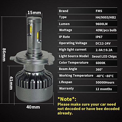 FMS H4 9003 HB2 LED Lampadine del Faro Kit 6000K Bianco H4 9003 HB2 Faro Bulbi Auto 9600LM