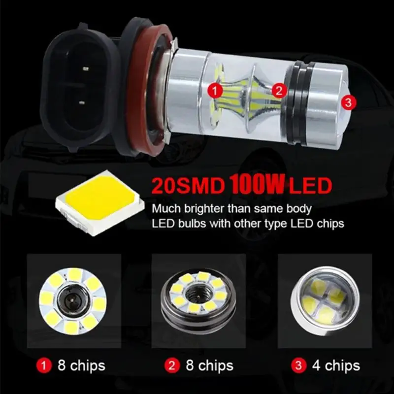 1pc 9005 HB3/9006 HB4/H10 9145/H11 H8 100W 6000K Super White Fog Light 2323 LED Driving Bulb DRL Daytime Running Light