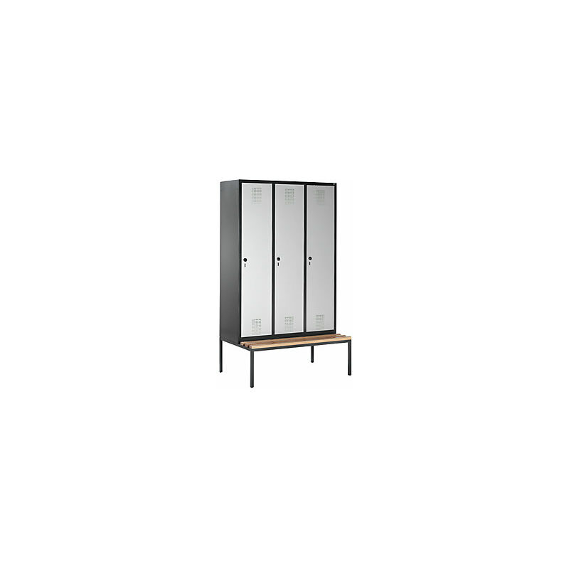 Armadietto guardaroba EVOLO, con panca portante, 3 scomparti, larghezza scomparti 400 mm, grigio nerastro / alluminio brillante. Fornitura = montato. Altezza = 2090 mm. Larghezza = 1200 mm. Profondità = 815 mm. Colore corpo = grigio nerastro RAL 7021. Colore porta = alluminio brillante RAL 9006. Serratura = predisposizione per chiusura con lucchetto. Numero scomparti in larghezza = 3 pz. Materiale = lamiera d'acciaio, con verniciatura a forno. Larghezza scomparti = 400 mm. Profondità scomparti = 500 mm. Dotazione interna = 1 cappelliera, 1 asta appendiabiti con 3 ganci. Altezza sedile = 420 mm. Profondità sedile = 315 mm. Altezza armadio = 1600 mm. Profondità armadio = 500 mm. Tipo di porta = ante piene. Colore doghe = faggio. Colore telaio = grigio nerastro RAL 7021. Versione = con panca integrata. Serie = EVOLO. Larghezza interna = 345 mm. Altezza interna = 1600 mm. Con panca portante. Panca con doghe in faggio. Porte con perni d'incernieramento - particolarmente robusti e