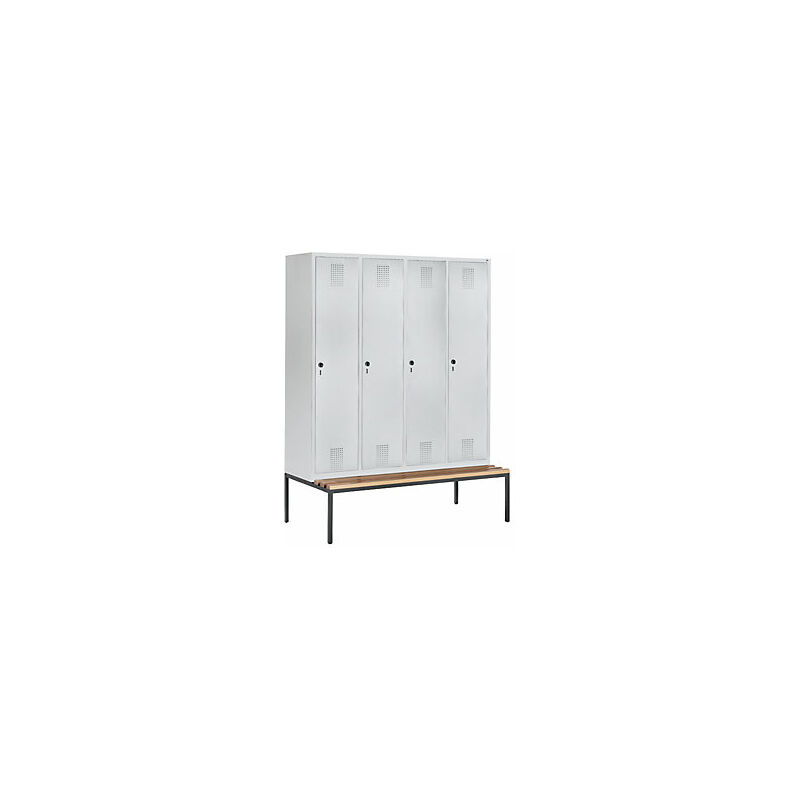Armadietto guardaroba EVOLO, con panca portante, 4 scomparti, larghezza scomparti 400 mm, grigio chiaro. Fornitura = montato. Altezza = 2090 mm. Larghezza = 1600 mm. Profondità = 815 mm. Colore corpo = grigio chiaro RAL 7035. Colore porta = grigio chiaro RAL 7035. Serratura = predisposizione per chiusura con lucchetto. Numero scomparti in larghezza = 4 pz. Materiale = lamiera d'acciaio, con verniciatura a forno. Larghezza scomparti = 400 mm. Profondità scomparti = 500 mm. Dotazione interna = 1 cappelliera, 1 asta appendiabiti con 3 ganci. Altezza sedile = 420 mm. Profondità sedile = 315 mm. Altezza armadio = 1600 mm. Profondità armadio = 500 mm. Tipo di porta = ante piene. Colore doghe = faggio. Colore telaio = grigio nerastro RAL 7021. Versione = con panca integrata. Serie = EVOLO. Larghezza interna = 345 mm. Altezza interna = 1600 mm. Con panca portante. Panca con doghe in faggio. Porte con perni d'incernieramento - particolarmente robusti e indeformabili. Chiusura ergonomica con