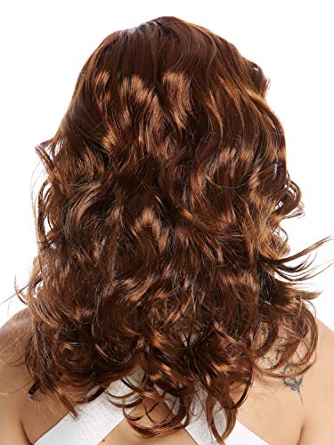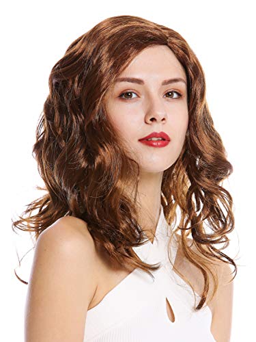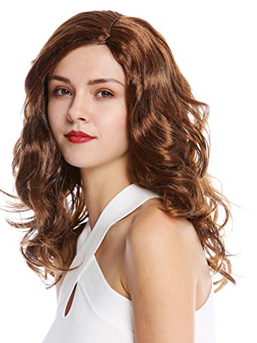 Parrucca da donna per Halloween e carnevale, da fanciulla molto disinvolta. I capelli castani di media lunghezza, che arrivano alle spalle, sono leggermente ondulati e divisi da una splendida riga in mezzo.