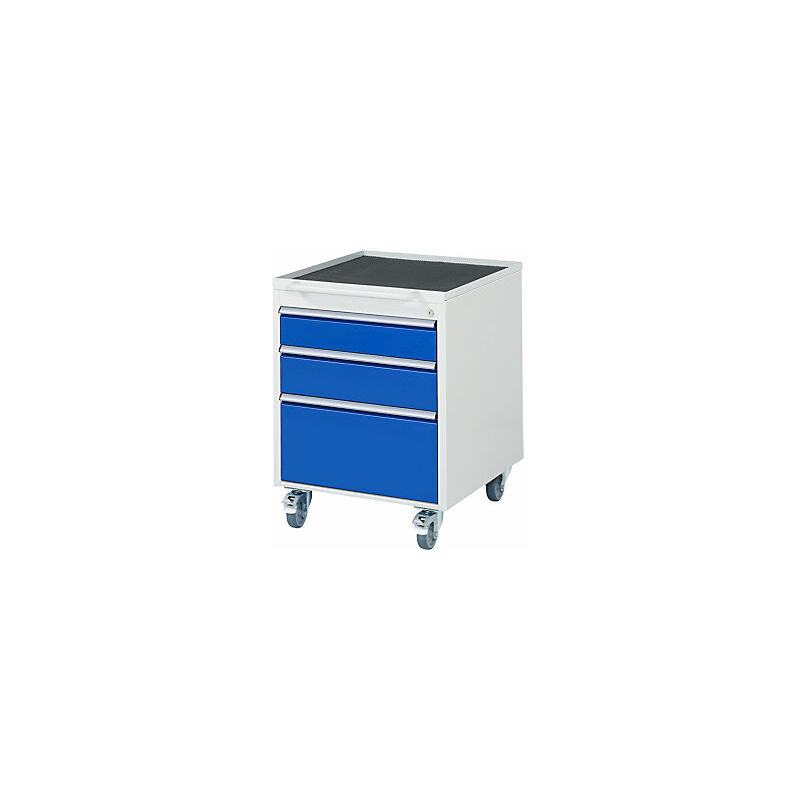Cassettiera con rotelle, alt. x largh. x prof. 765 x 580 x 650 mm, 3 cassetti, grigio chiaro / blu genziana. Fornitura = smontato. Altezza = 765 mm. Larghezza = 580 mm. Profondità = 650 mm. Numero cassetti = 3 pz. Altezza cassetti = 1x120, 1x150, 1x270 mm. Colore corpo = grigio chiaro RAL 7035. Colore frontalino = blu genziana RAL 5010. Materiale = lamiera d'acciaio, verniciata a polvere. Caratteristiche = con rotelle. Dotazione ruote = 4 rotelle pivottanti, di cui 2 con fermi. Top con bordino anticaduta e stuoia in gomma. 4 rotelle pivottanti, di cui 2 con fermo, Ø 100 mm.