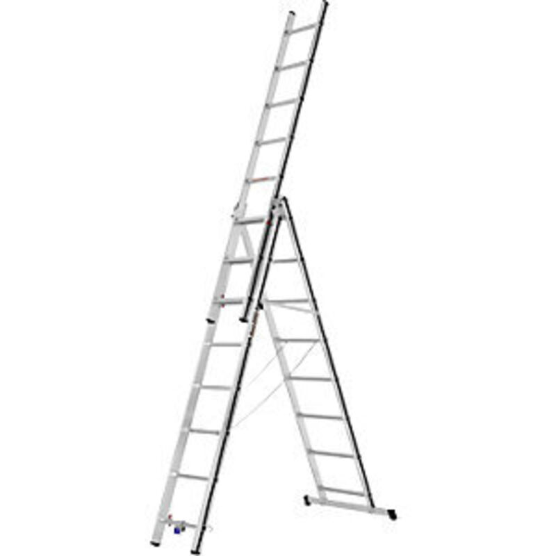 Scala multiuso in alluminio, modello base, 3 x 8 pioli, altezza di lavoro max 5,96 m. Fornitura = in parte smontato. Tipo di prodotto = scale multiuso. Versione da salita = pioli. Numero pioli = 3x8 pz. Materiale telaio = alluminio. Materiale pioli = alluminio. Altezza di lavoro come scala a libro = 4290 mm. Lunghezza come scala d'appoggio = 5110 mm. Lunghezza da richiuso = 2320 mm. Altezza di lavoro = 5960 mm. Altezza di lavoro come scala d'appoggio = 5960 mm. Altezza verticale max come scala a libro con prolunga = 3490 mm. Distanza pioli = 280 mm. Profondità pioli = 30 mm. Modello base ad un prezzo eccezionale. Sicurezza antidivaricamento grazie a cinghie in perlon ad alta resistenza e un tirante rigido. Possibilità di utilizzo su gradini (incluso dispositivo). Appoggio stabile grazie alla larga traversa di base. I montanti in profilati estrusi di alluminio offrono la massima stabilità. Piedini antiscivolo. Pioli in tubi quadri con superficie mandorlata, 30 x 30 mm, per una salita