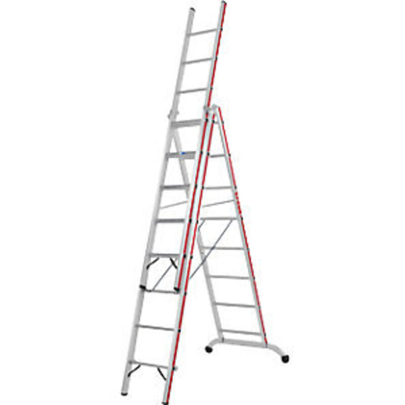 Scala multiuso in alluminio, versione industriale, 3 x 8 pioli, altezza di lavoro max 6,35 m. Fornitura = in parte smontato. Tipo di prodotto = scale multiuso. Versione da salita = pioli. Numero pioli = 3x8 pz. Materiale telaio = alluminio. Materiale pioli = alluminio. Lunghezza per ogni elemento scala = 2430 mm. Altezza di lavoro come scala a libro = 4650 mm. Lunghezza come scala d'appoggio = 5510 mm. Lunghezza da richiuso = 2430 mm. Altezza di lavoro = 6350 mm. Altezza di lavoro come scala d'appoggio = 6350 mm. Altezza verticale max come scala a libro con prolunga = 3950 mm. Distanza pioli = 280 mm. Profondità pioli = 30 mm. Montanti massicci per un impiego professionale industriale. Traversa curva per un'ottima stabilità d'appoggio anche su fondi sconnessi. Robusti snodi in acciaio e staffe di rinforzo sul primo gradino. Pioli con profilo antiscivolo. Sicurezza antidivaricamento grazie a cinghie in perlon ad alta resistenza e 2 tiranti rigidi. Dispositivo aggiuntivo per l'utilizzo