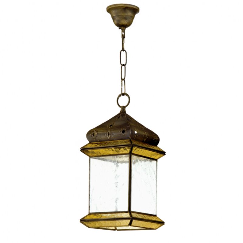 Ciondolo serie Ambarina colore ambra. Realizzato in vetro e metallo. Il suo design è ispirato all'arte califfale. Le sue dimensioni sono 50 & lt, 70X18X18 cm (con altezza regolabile) e il portalampada E27. È inteso per coperto all'interno o all'aperto. Si distingue per i suoi fori a forma di stella che forniscono giochi di luce.
