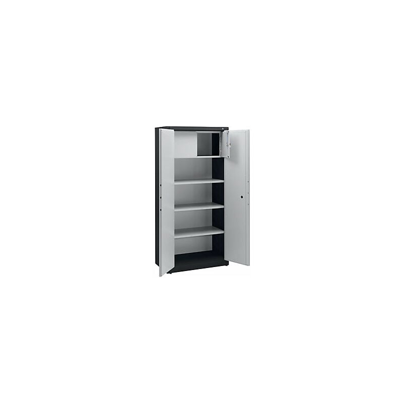 Armadio in acciaio con protezione antincendio, a norma UNI 4102, alt. x largh. x prof. 1950 x 930 x 500 mm, grigio nerastro/grigio chiaro, con serratura. Fornitura = montato. Tipo di prodotto = armadietti di sicurezza con protezione antincendio. Campo d'applicazione = protezione antincendio, sicurezza di documenti. Protezione antincendio = DIN 4102. Altezza = 1950 mm. Larghezza = 930 mm. Profondità = 500 mm. Serratura = serratura di elevata sicurezza a doppio ingegno. Dotazione = 3 ripiani, 1 scomparti con serratura. Altezza interna = 1810 mm. Larghezza interna = 878 mm. Profondità interna = 429 mm. Spessore del corpo = 52 mm. Materiale = acciaio, laccato. Colore = grigio nerastro RAL 7021, grigio chiaro RAL 7035. Numero ante = 2 pz. Peso = 120 kg. Protezione da piccoli incendi e tentativi di effrazione. Protezione antieffrazione grazie al meccanismo di chiusura quintuplo e alla serratura di sicurezza. Protezione antincendio secondo DIN 4102. Gli armadi antincendio in acciaio sono
