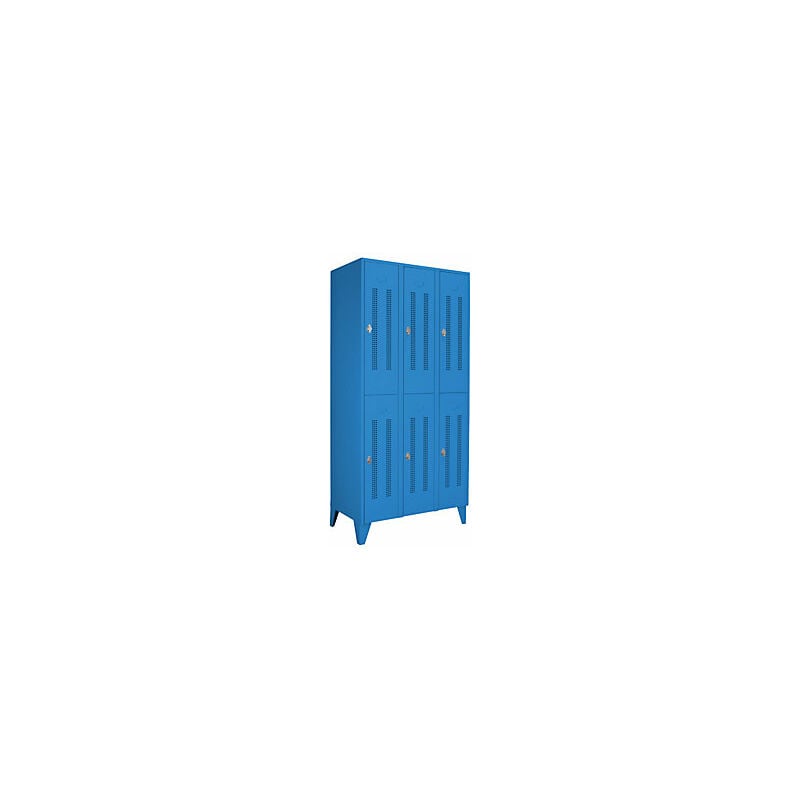 Armadietto in acciaio con piedini, scomparti a metà altezza, ante forate, larghezza scomparti 300 mm, 6 scomparti, blu chiaro. Fornitura = montato. Altezza = 1850 mm. Profondità = 500 mm. Larghezza = 900 mm. Colore corpo = blu chiaro RAL 5012. Colore porta = blu chiaro RAL 5012. Serratura = chiavistello girevole. Numero scomparti in larghezza = 3 pz. Numero scomparti = 6 pz. Larghezza scomparti = 300 mm. Materiale = lamiera d'acciaio. Altezza armadietto = 1850 mm. Dotazione interna = 1 asta appendiabiti, 3 ganci scorrevoli. Larghezza interna = 298 mm. Altezza interna = 820 mm. Profondità interna = 475 mm. Tipo di porta = ante forate. Altezza scomparti = 820 mm. Larghezza ripiani = 300 mm. Profondità ripiani = 500 mm. Altezza piedini = 150 mm. Struttura = saldata a punti. Superficie = con verniciatura a forno. Robusto armadietto con piedini a norma DIN 4547. Spazio ottimizzato grazie agli scomparti a mezza altezza. Disponibili in varie larghezze e colori. A scelta con ante forate o
