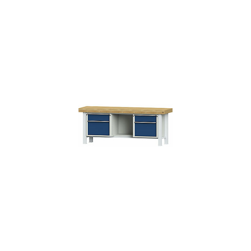 Banco da lavoro per carichi pesanti, larghezza piano 2250 mm, con 2 cassetti e 2 ante a battente, spessore piano 100 mm. Fornitura = montato. Larghezza piano = 2250 mm. Profondità piano = 700 mm. Tipo di piano = piano in faggio massello. Spessore piano = 100 mm. Numero cassetti = 2 pz. Altezza cassetti = 2x180 mm. Altezza di lavoro = 900 mm. Colore corpo = grigio chiaro RAL 7035. Colore frontalino = blu genziana RAL 5010. Versione cassetti = guida a rulli. Portata per cassetto = 100 kg. Estrazione cassetti = 86%. Materiale telaio = acciaio, verniciato a polvere. Numero ante = 2 pz. Altezza porta = 2x360 mm. Portata statica = 4000 kg. Versione telaio = tubo a sezione quadrata, 80x80x3 mm. Colore telaio = grigio chiaro RAL 7035. Serratura = chiusura centralizzata a cilindro con nucleo sostituibile. Portata fino a 4 tonnellate a seconda della versione. Massima stabilità - componenti del corpo ribattuti fino a 10 volte. Resistente piano di lavoro in listelli di faggio a incastri incollati