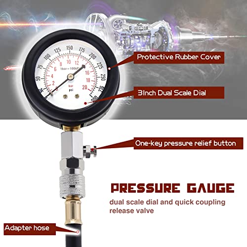 【Tester eccellente】: doppio manometro massimo 300 PSI o 20 BAR, coperchio del manometro in vetro acrilico con rivestimento antigraffio e custodia protettiva in gomma con eccellenti prestazioni di assorbimento degli urti. La valvola di non ritorno incorporata con funzione di mantenimento della pressione assicura che il manometro riceva la pressione massima alla candela durante il processo di compressione.