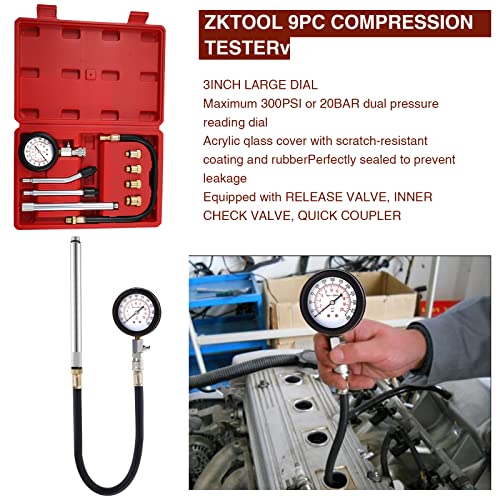 9PCS Tester Pressione di Compressione, Rilevatore di Perdite di Cilindro Auto Tester, Manometro per Test del Motore per Kit Tester di Compressione per Cilindri del Motore a Benzina