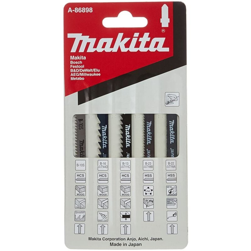Makita a-86898 set 5 lame seghetto alternativo assortito legno metallo plastica descrizione la confezione include 5 lame per seghetto alternativo, adatte per: metallo, legno, alluminio, plastica. tipo gambo universale. lame per tipo: 1 b-10s 1 b-16 t144d 1 b-13 t111c 1 b-23 t118b 1 b-22 t118a