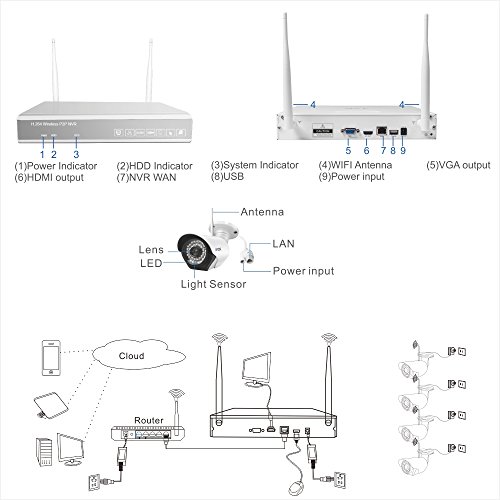 A-ZONE Sistema di sicurezza con telecamere wireless IP a circuito chiuso NVR 1.0 MP, con 4 canali, a 960P - connessione quadrupla con codice QR, 1280TVL, 1,0 megapixel, impermeabile, per casa, ufficio, visione notturna a 24,4 m con infrarossi e LED