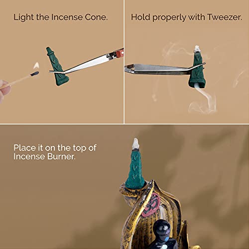 Linee guida per l'uso: posiziona il cono di riflusso nel punto designato nel bruciatore di incenso a riflusso Aakriti. Accendi la punta per 3-5 secondi. Spegni delicatamente la fiamma e attendi qualche secondo che il cono rilasci