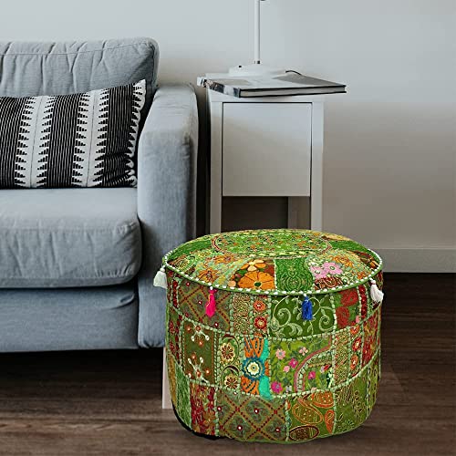 Aakriti Indian Pouf Footstool with Embroidery Pouf, Indian Cotton, Pouf, Ottoman Pouf Cover with Ethnic Decor Art - Cover (Green, 56x35 cms)