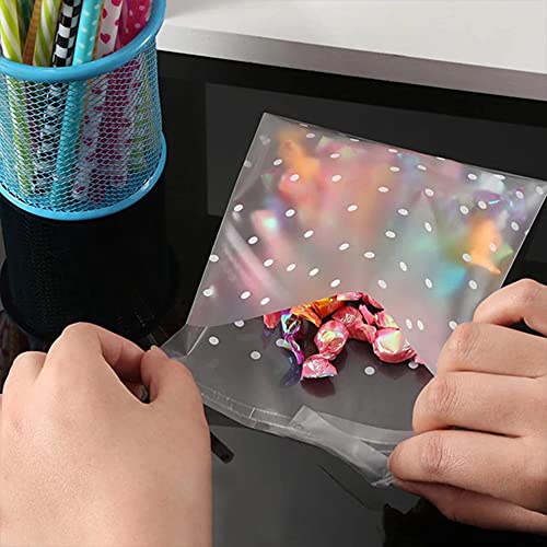 Aspetto squisito: il sacchetto di cellophane autoadesivo ha un design a puntini bianchi sulla superficie, che è squisito e carino, ed è amato dai bambini.L'aspetto trasparente consente di vedere il contenuto della borsa a colpo d'occhio.