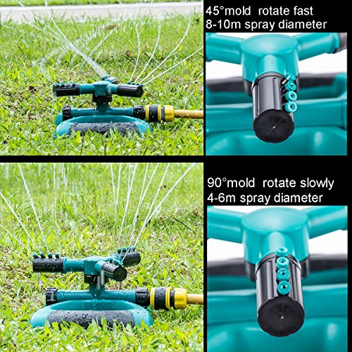 【 lunga distanza di spruzzo e grande copertura 】 con tubi standard internazionale, la gamma spray è 26 ft-32.8ft in acqua di diametro. con una distanza di spruzzo fino a 10 m per la massima esposizione (pressione dell' acqua 60 psi). La Smart Lawn irrigatore ha tre bracci che può essere ruotato di 360 gradi. Si tratta di un efficiente, rapido doccetta.