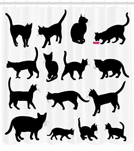 ABAKUHAUS Gatto Tenda da Doccia, Gattini Neri Domestici Paws, Tessuto Set di Decorazioni per Il Bagno con Ganci, per la Vasca da Bagno, 175 cm x 220 cm, Nero Bianco