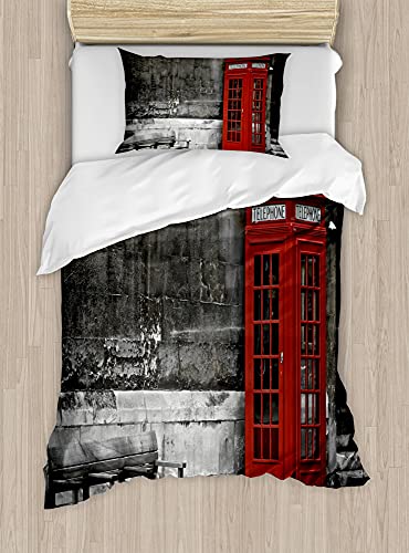 ABAKUHAUS Londra Set Copripiumino, Famoso Punto di Riferimento della Città, Decorativo 2 Pezzi con 1 Federa Cuscino, 170 x 220 cm - 75 x 50 cm, Grigio Rosso