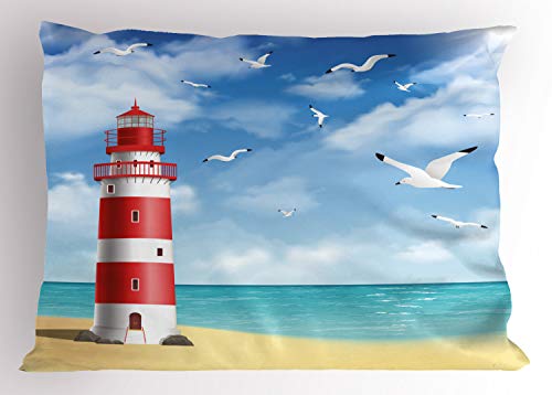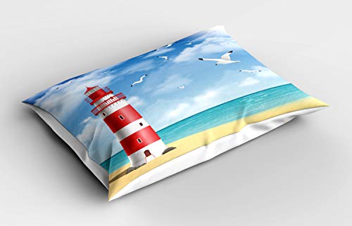 ABAKUHAUS Spiaggia Federe Cuscini Stampata, Faro Gabbiani Ocean, Decorativo e Dimensioni Standard, 80 cm x 40 cm, Vermilion Blu
