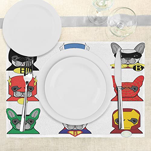 ABAKUHAUS Supereroe Tovaglietta Americana Set di 4, Cartoon Bulldog Art, Tovagliette in Tessuto Lavabile per Tavolo da Pranzo Cena, Multicolore