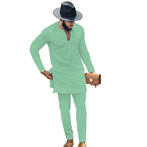 Abbigliamento africano per gli uomini Dashiki Manica Lunga Top Pant 2 Pezzo Vestito Tradizionale Moda Tuta, Verde chiaro, XXL