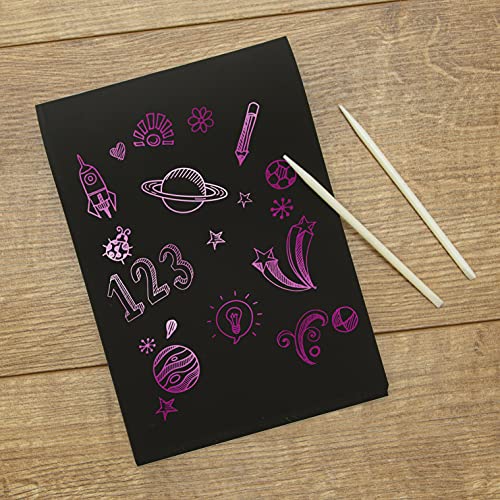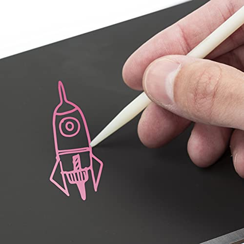 Include 2 robusti strumenti per graffi in plastica. Utilizzare lo strumento per graffiare via la superficie nera opaca della carta, rivelando lo sfondo olografico rosa - produce incredibili opere d'arte creative e scarabocchi. Fa un'eccellente attività di disegno artistica e artigianale per i bambini o gli appassionati di arte adulta.