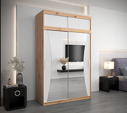ABIKSMEBLE Monaco - Armadio con ante scorrevoli 150 armadio con asta e ripiano armadio per camera da letto con specchio (rovere artigianale + bianco opaco con estensione)