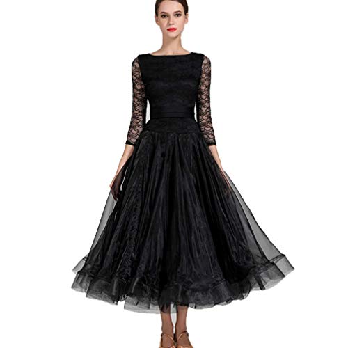 Abiti da Ballo Standard Nazionali per Donne Costume da Competizione Pizzo Cucitura Vestito da Sociale Tango Moderno Sala da Ballo Gonna Grande Swing in Tulle,Nero,L