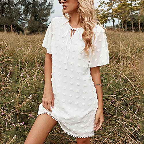 Abito Casual da Donna Abito Estivo Casual Manica Corta Abito da Spiaggia con Scollo a V Abito Elegante Prendisole Abito Jacquard Abito Casual a Pois per la Primavera Estate(S-Bianco)