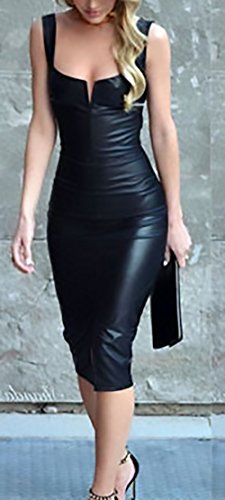 Abito Cerimonia Donna Elegante Finta Pelle Vestito da Cocktail Smanicato V Scollo Slim Pacchetto Hip Tubino Moda Club Partito Abiti da Sera