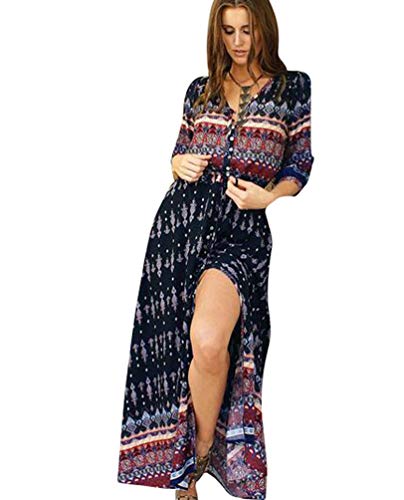 Abito Donna Vintage V Scollo A Stile Semplice Stampa 3 4 Maniche Boho Abito A Fessura Abito Maxi Abito Spiaggia Abito Floreale con Bottoni Davanti (Color: Schwarz+Lang, One Size: M)