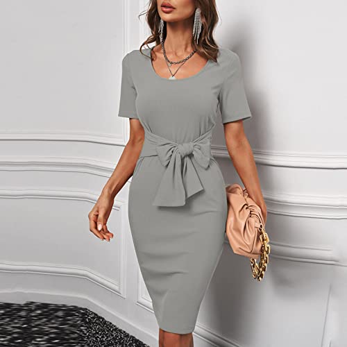 Abito estivo da donna, elegante, con fiocco, tinta unita, scollo rotondo, a maniche corte, mini abito da donna, per le vacanze, per la spiaggia, grigio., S