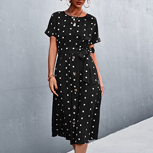 Abito Estivo da Donna a Pois Manica Corta Girocollo Abito da Spiaggia Vita Alta di Media Lunghezza Abito a Linea Elegante Casual Abiti da Cocktail Allentati Abito a Tunica con Cintura in Vita(XL-Nero)