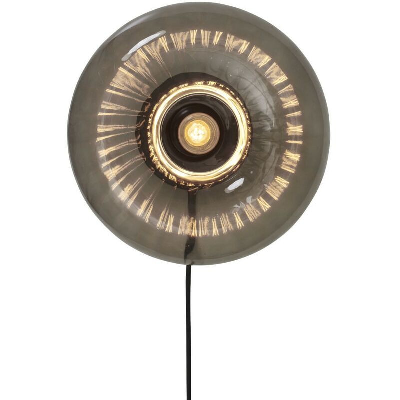 Lampada da parete in vetro fumè con struttura in metallo dorato, può essere utilizzata anche come plafoniera 1 lampadina E27 max 40W NON INCLUSA IP20 Lunghezza cavo elettrico 250 cm Dimensioni: Diametro 38 cm, H 13 cm
