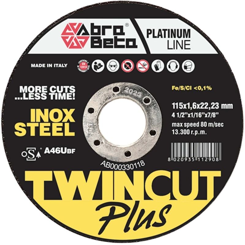 Utilizzabile su acciai inossidabili, acciai legati ed acciai trattati e non.Foro 22,23 mm Diametro 230 mm Spessore 2,0 mm