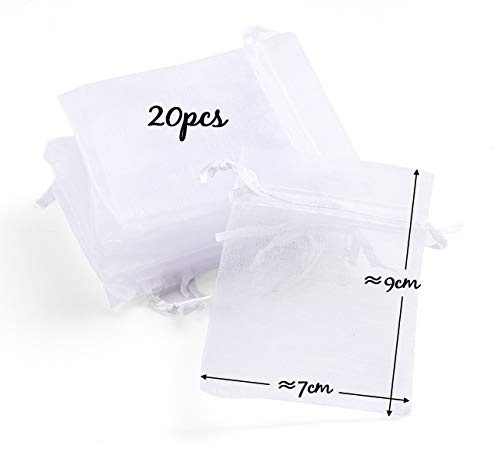 Set squisito: 20 ciondoli a forma di angelo bianchi (con nastri rosa) con 20 sacchetti in organza bianchi, perfetti per matrimoni, Natale, feste di compleanno e regali per tutti i tipi di occasioni