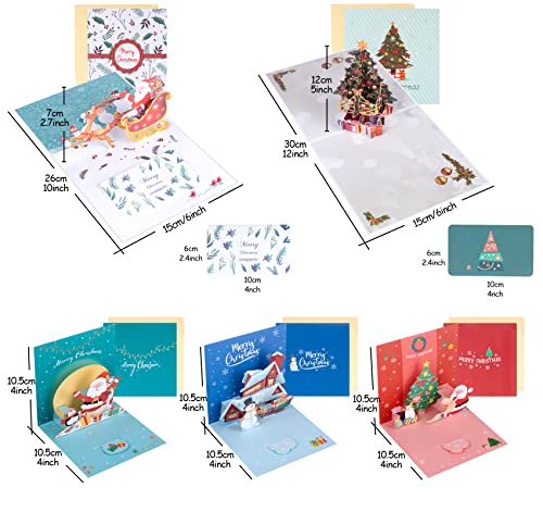 3 stili quadrati colorati, dimensioni: 10,2 x 10,2 cm, un totale di 9 modelli. Tutti gli stili sono biglietti di Natale pop-up 3D, ognuno con uno spazio vuoto per scrivere una benedizione, lo stile di stampa ha 2 schede di messaggio aggiuntive.