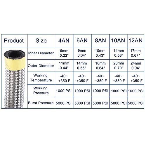 Pressione di scoppio: 5000 PSI / 345 Bar. Temperatura di esercizio: da -40 gradi F a +350 gradi F.