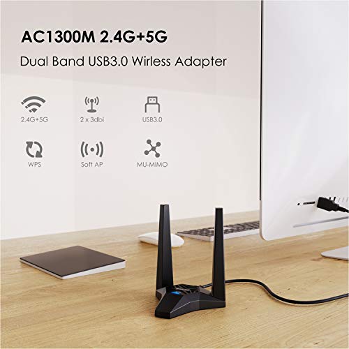 AC1300 USB WiFi Dongle per PC/Laptop, 1300 Mbps USB 3.0 adattatore WiFi con 2.4G/400Mbps + 5G/866Mbps, base magnetica, alto guadagno 2x3dBi antenne, Soft AP, WPS per Windows XP/7/8/10, Mac OS, Macbook