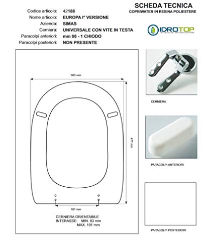ACB/COLBAM Copriwater in Legno Rivestito di Poliestere per Simas Europa 1' Versione Bianco Cerniera Cromo-Sedile-ASSE WC