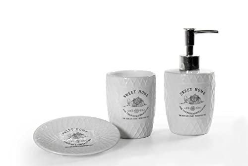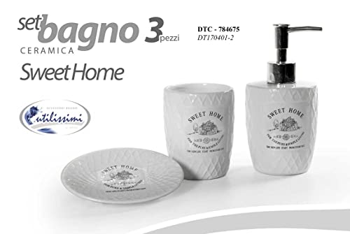 Set 3 pz accessori bagno dosatore porta sapone liquido solido e bicchiere portaspazzolini in ceramica bianco decorato sweet home DTC-784675