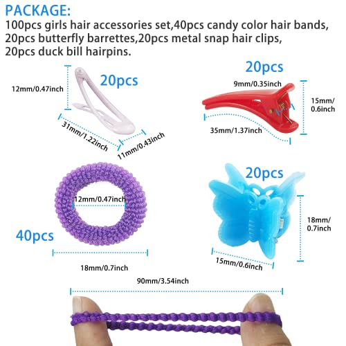 Set di 100 accessori per capelli per ragazze,40 elastici in gomma color caramella,20 fermagli a farfalla,20 fermagli per capelli in metallo,20 forcine per capelli a forma di anatra