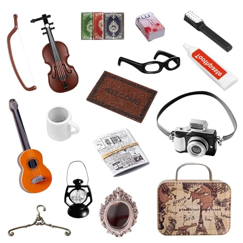 [1:12 Accessori casa bambole] Ce ne sono 17 diversi in oggetti in miniatura 1: 12 oggetti in miniatura, molto adatti per la decorazione della casa delle bambole. Il set di accessori casa bambole comprende libri, scatole, macchine fotografiche, lampade al cherosene, chitarre, violini, bicchieri, giornali, appendiabiti, tappeti e utensili di lavaggio e specchi. Diversi oggetti in miniatura possono soddisfare qualsiasi esigenza di voi e delle vostre bambole.